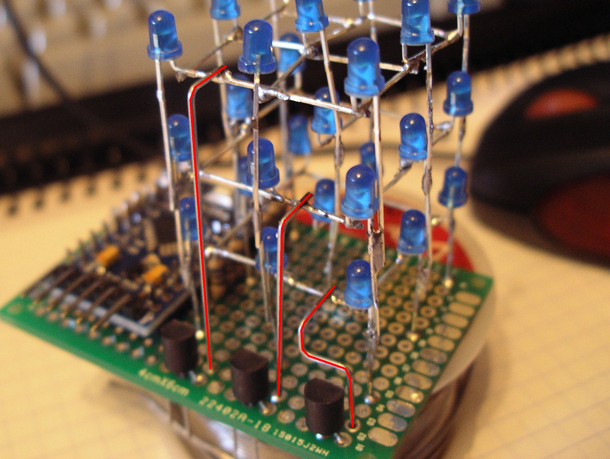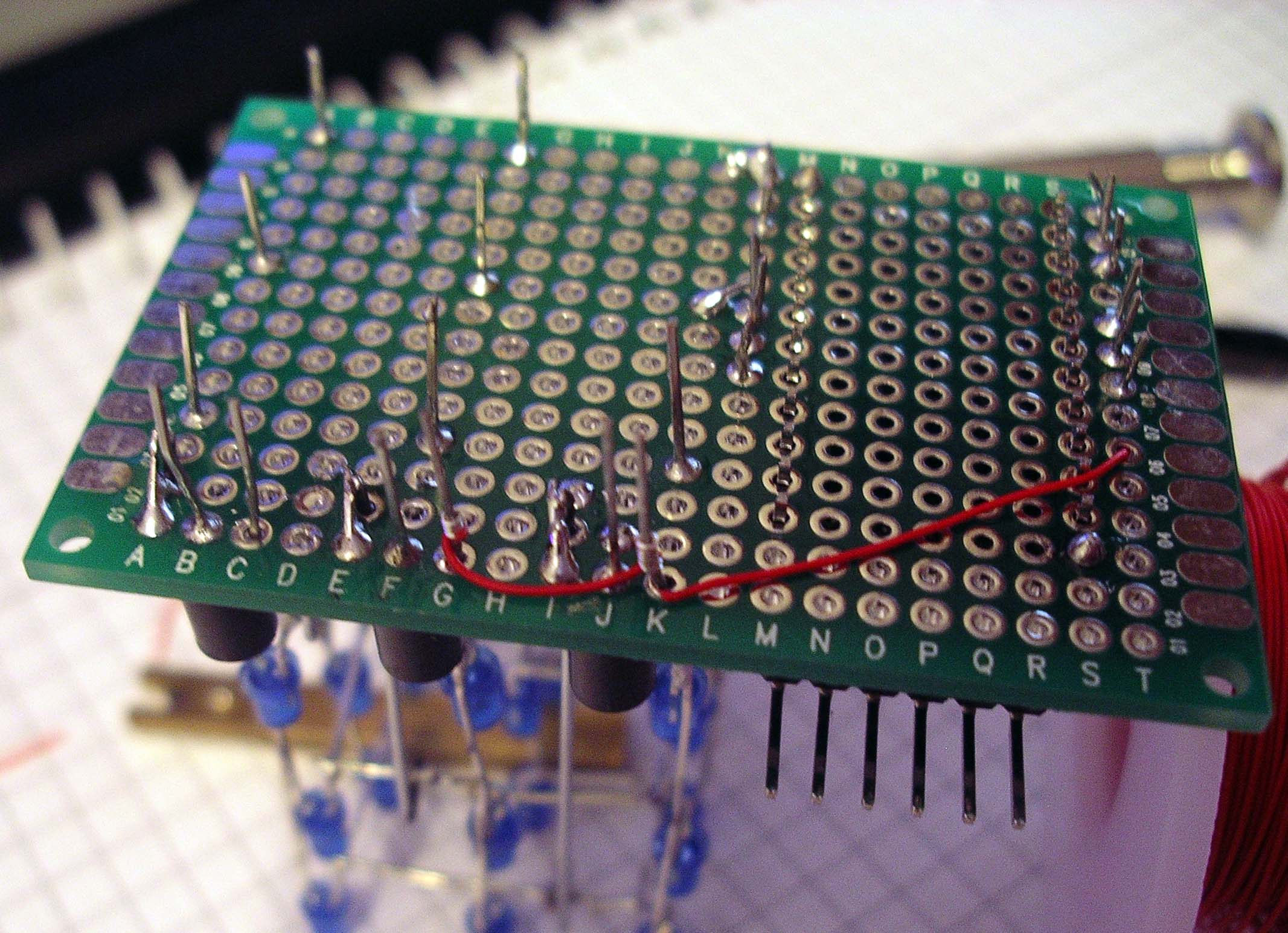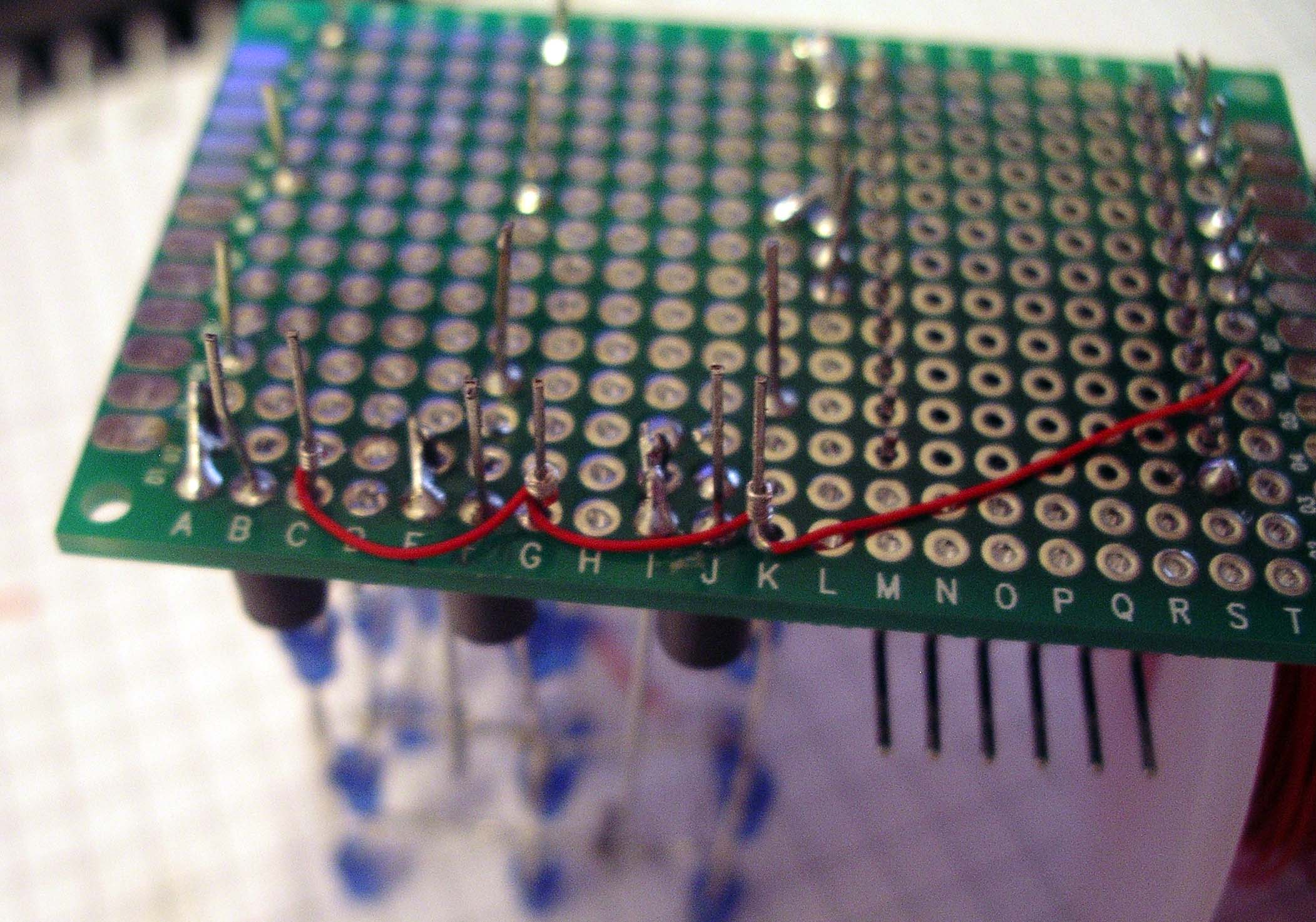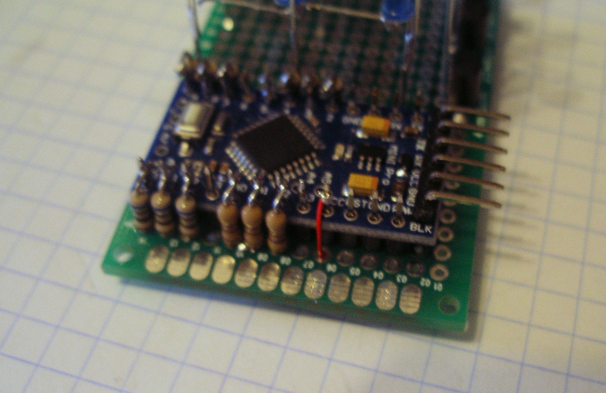 La última fila de LEDs va conectado a resistencias 10, 11 y 12 (el alambre verde en la foto). |