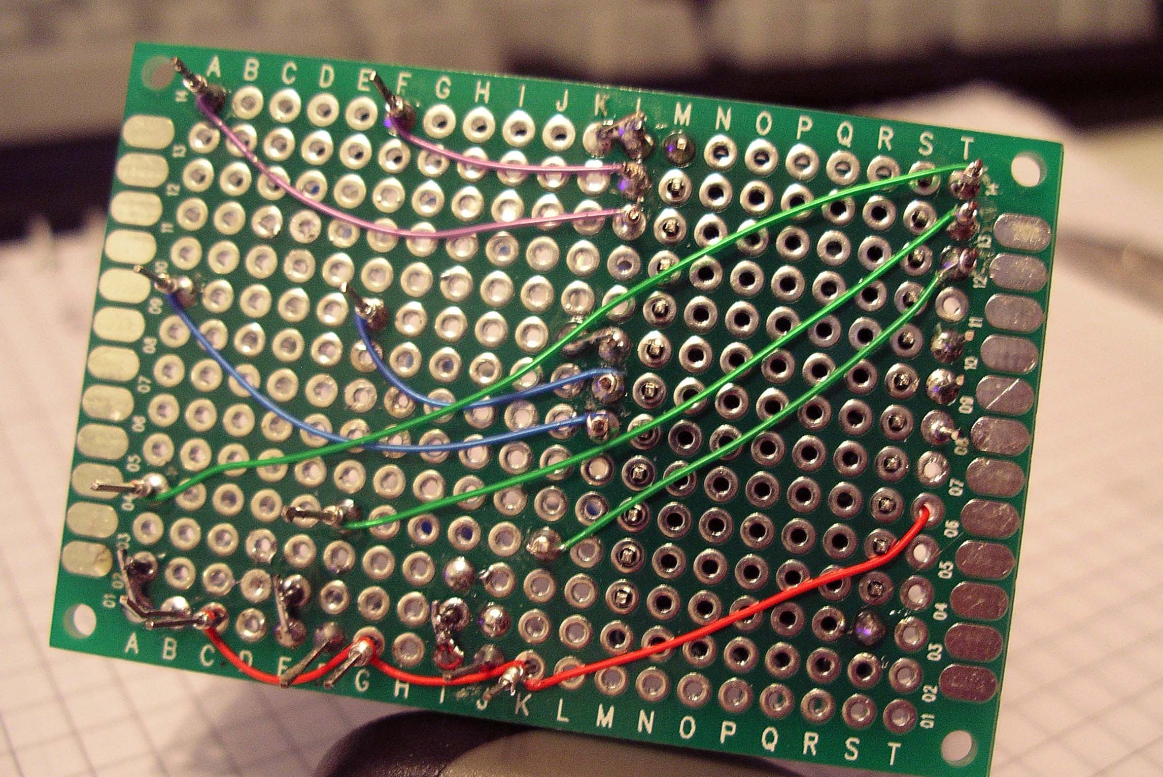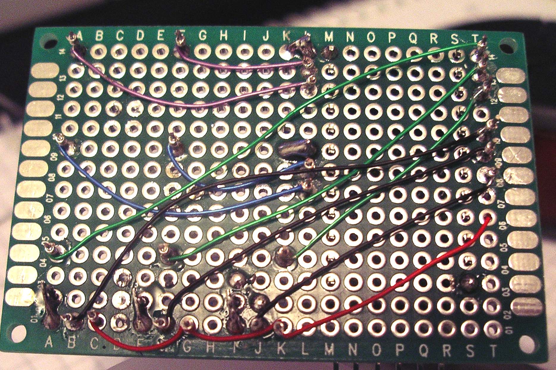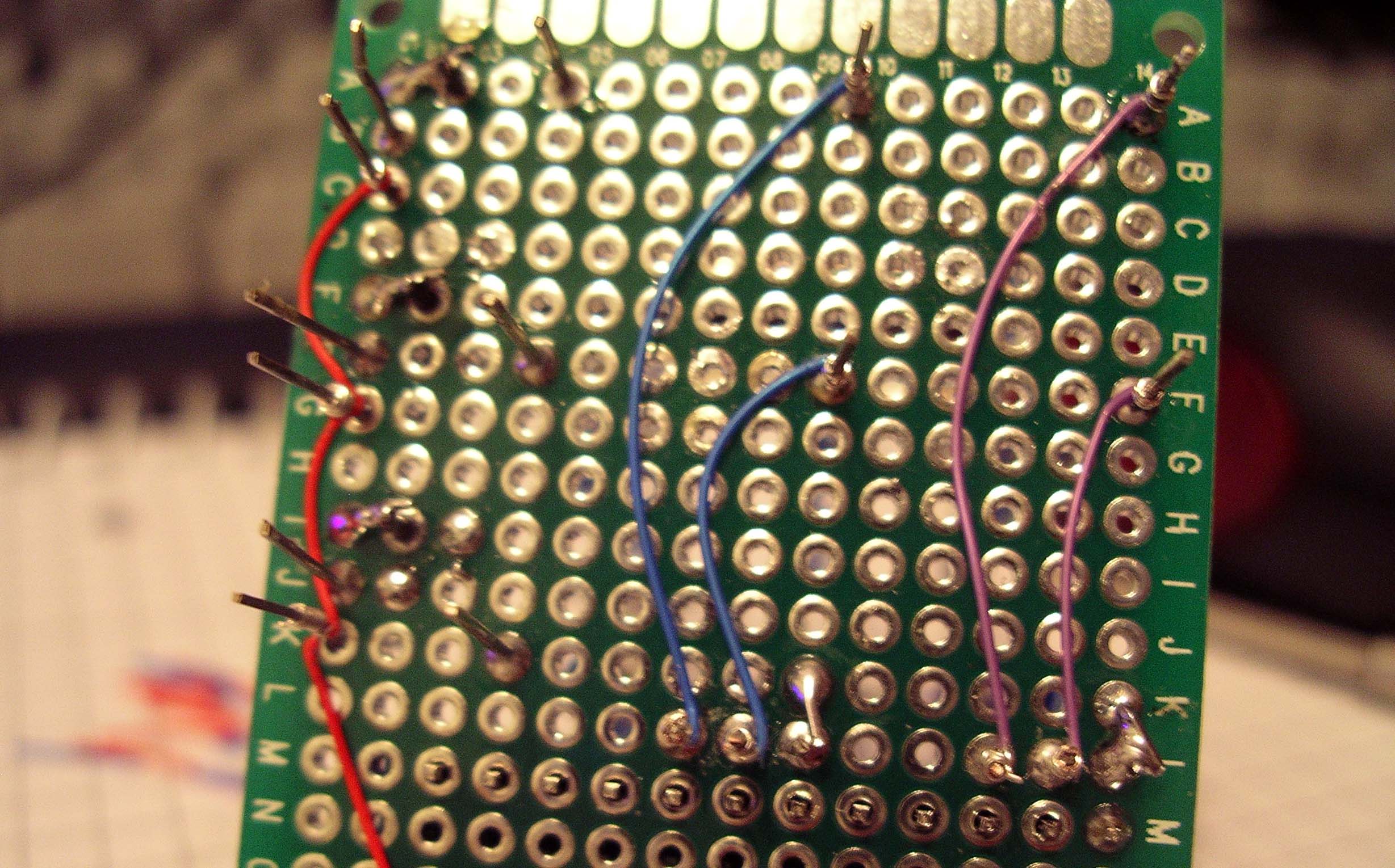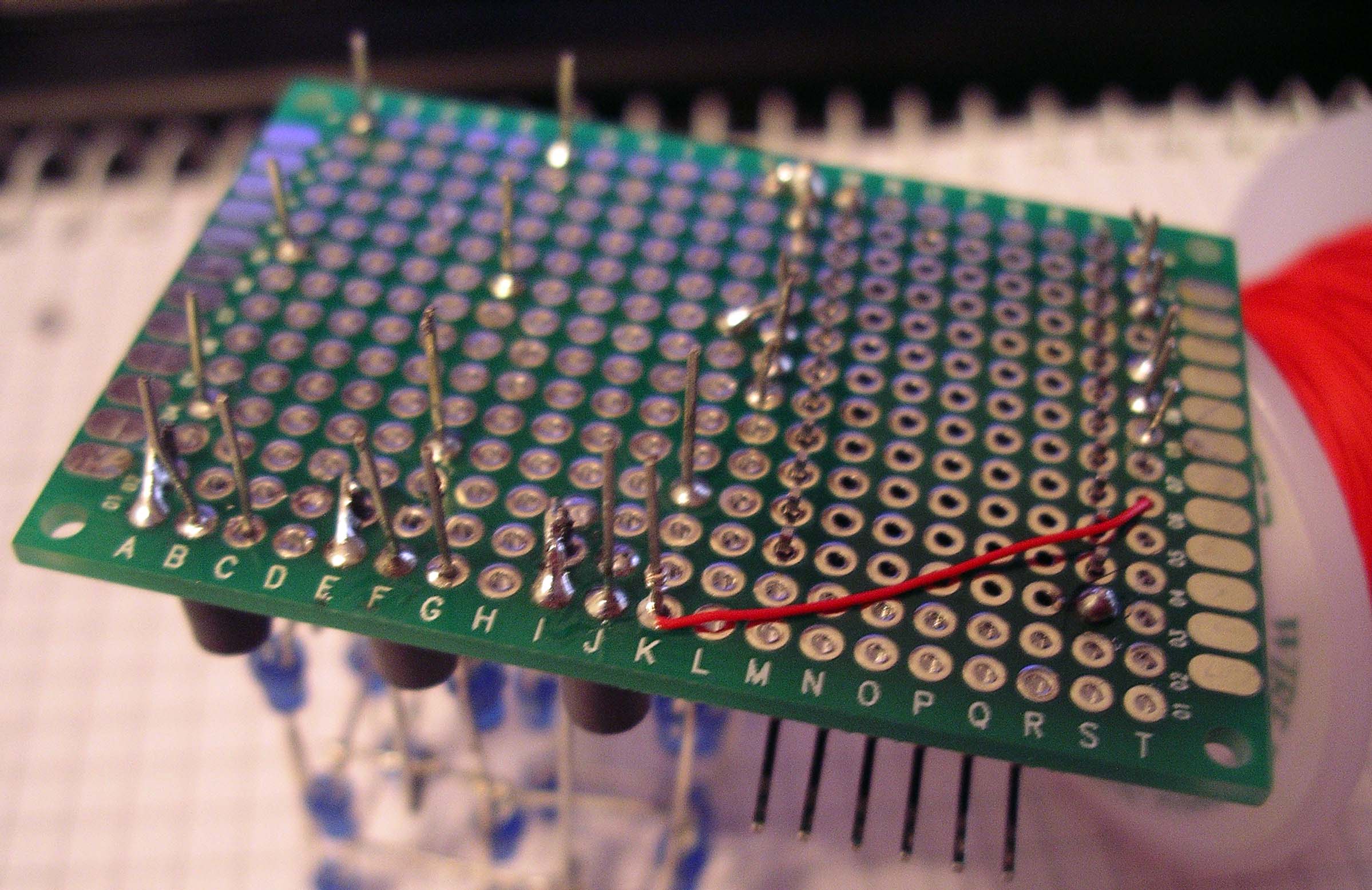 Ahora solo falta conectar los componentes entre si por debajo de la placa. Empezamos conectando un alambre al pin "Vcc" (+5V) del Arduino a traves de la placa base. |
