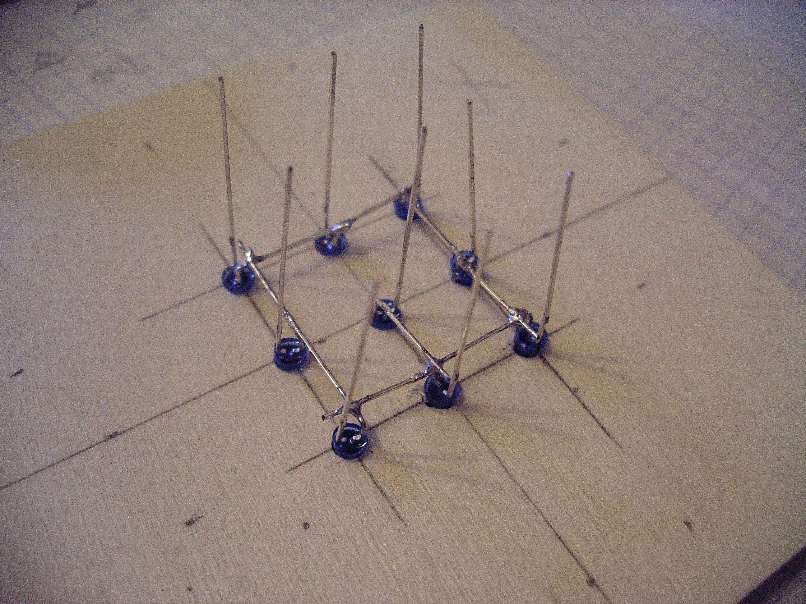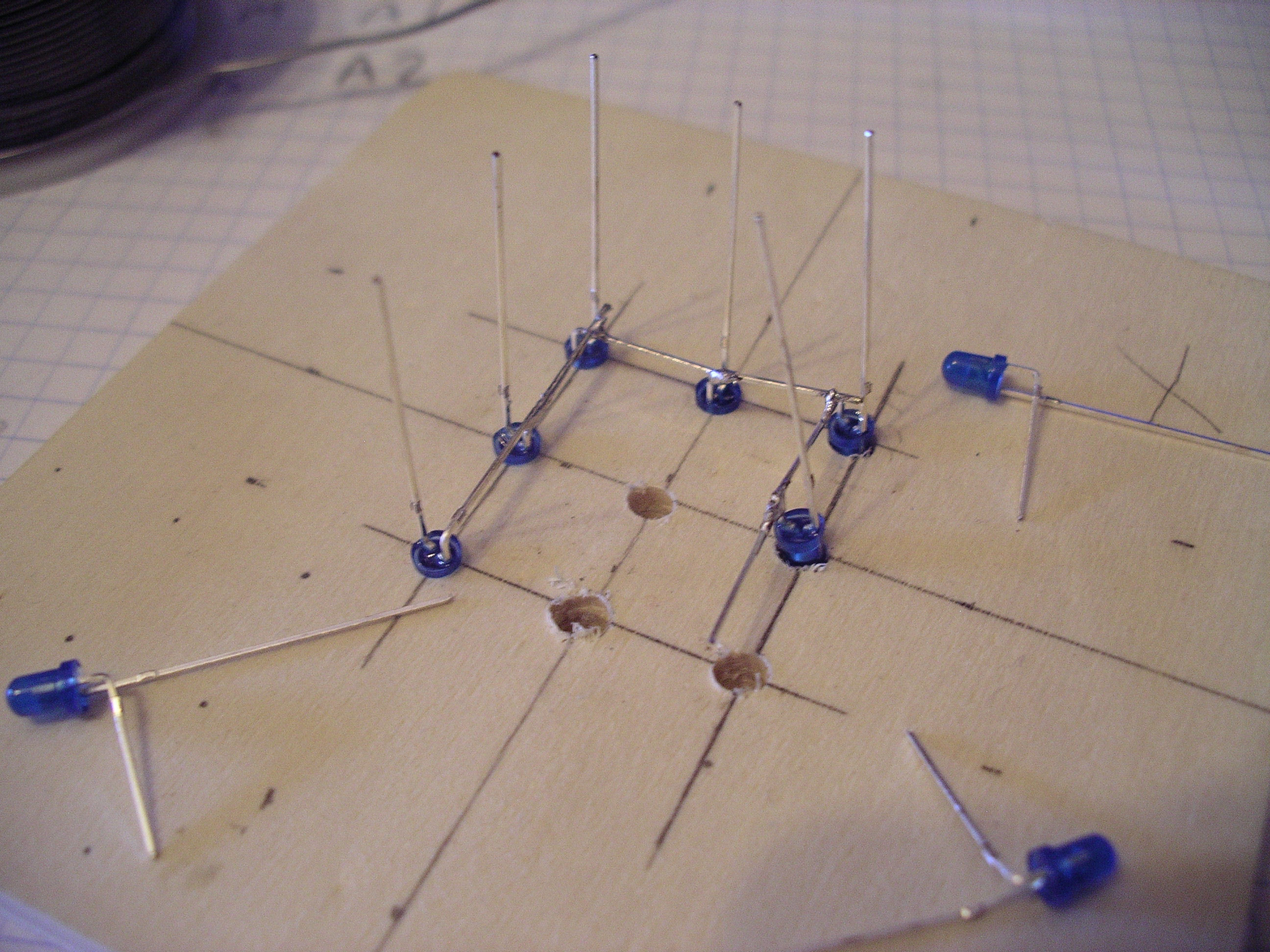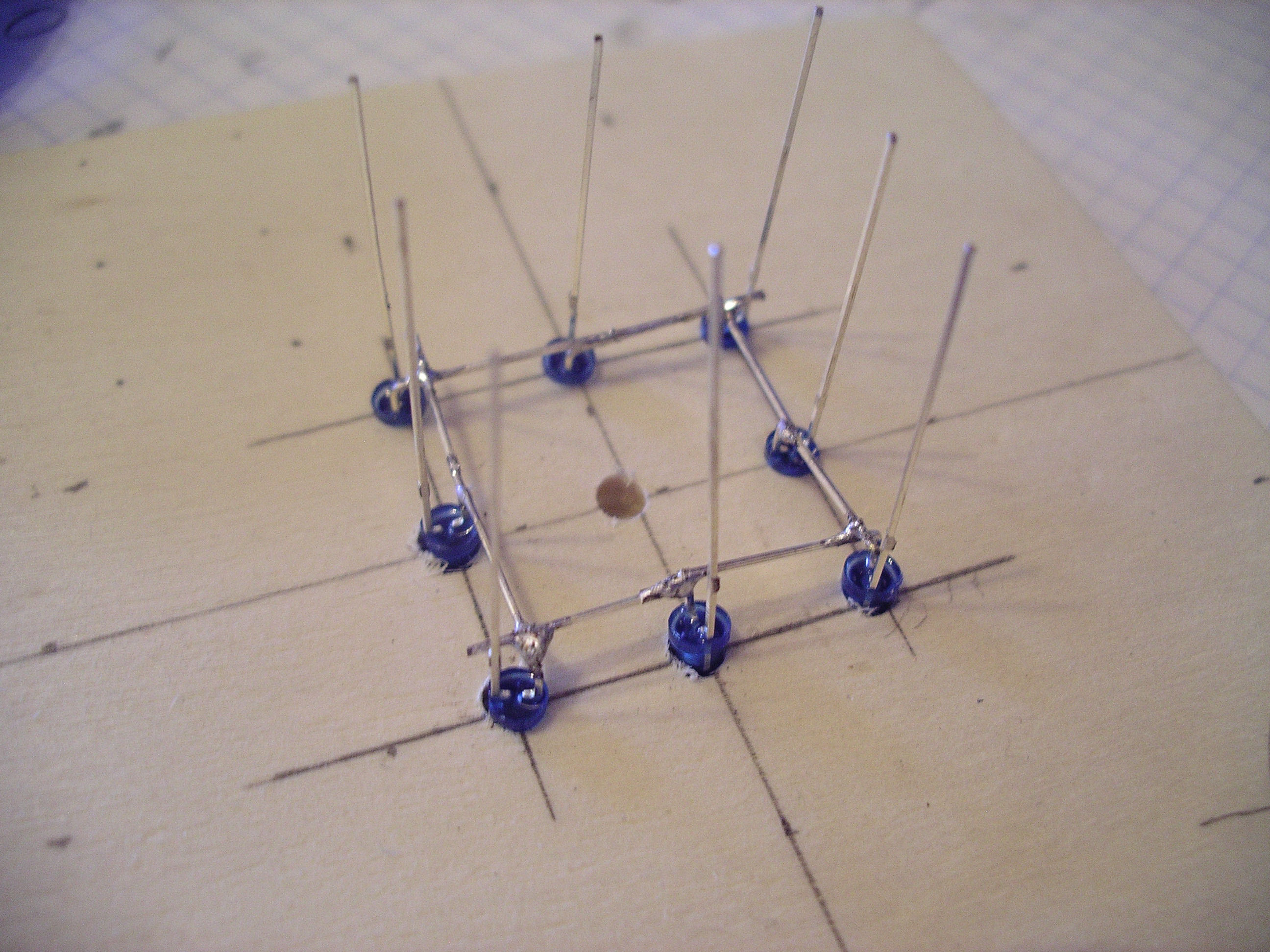 Para cada piso del cubo necesitamos 9 LEDs. Prepara cada LED, doblando la pata larga a 90 grados como en la foto. |