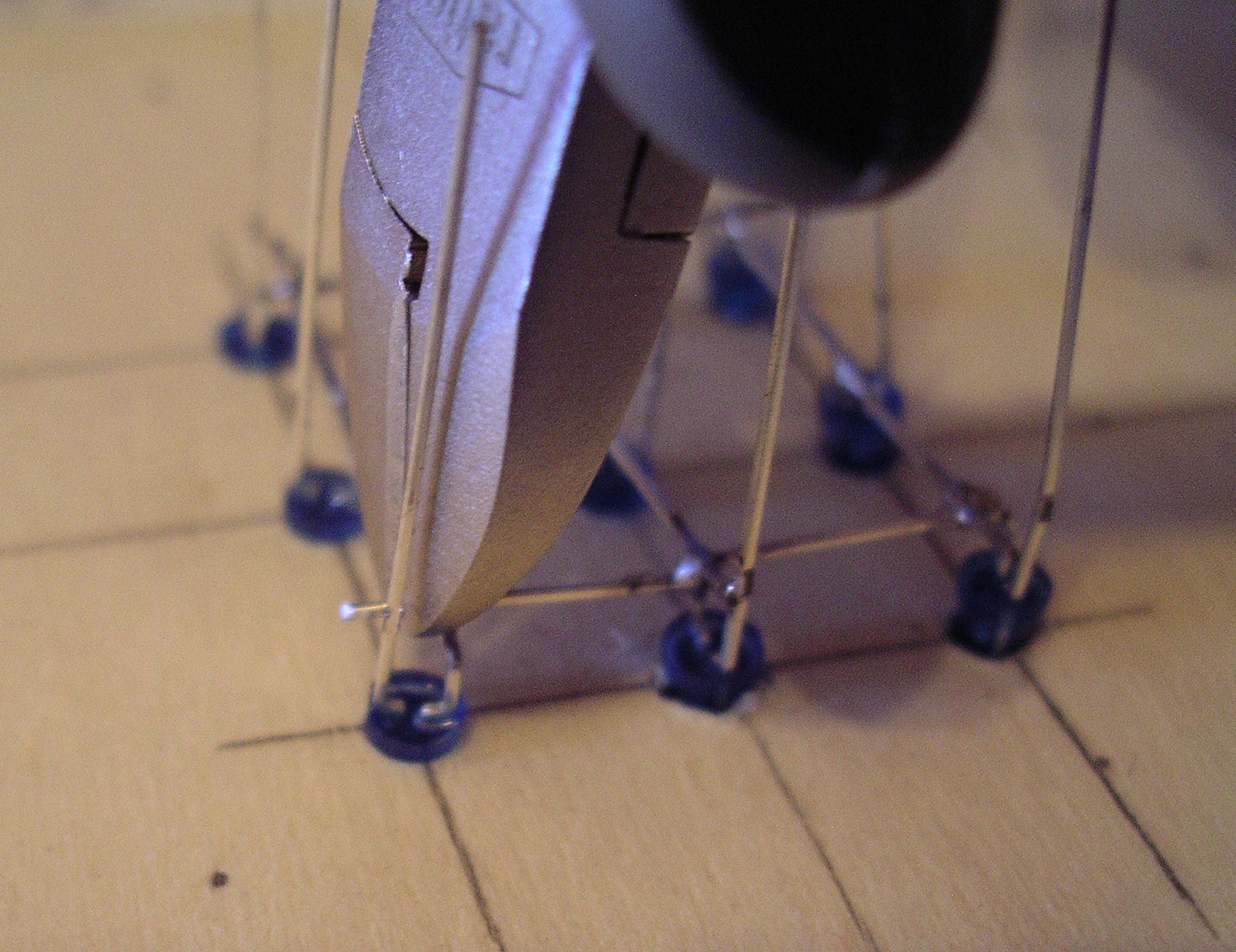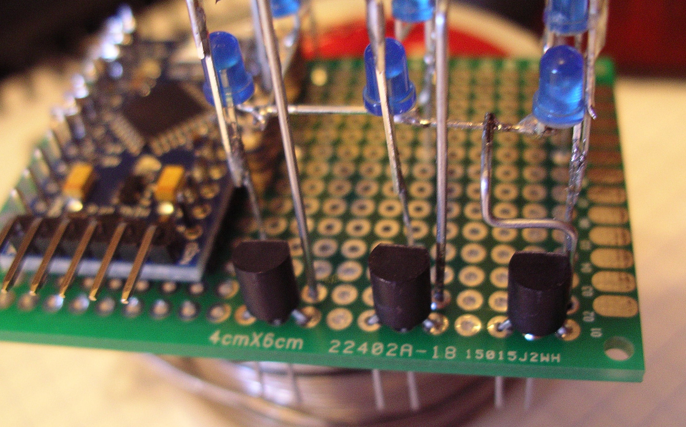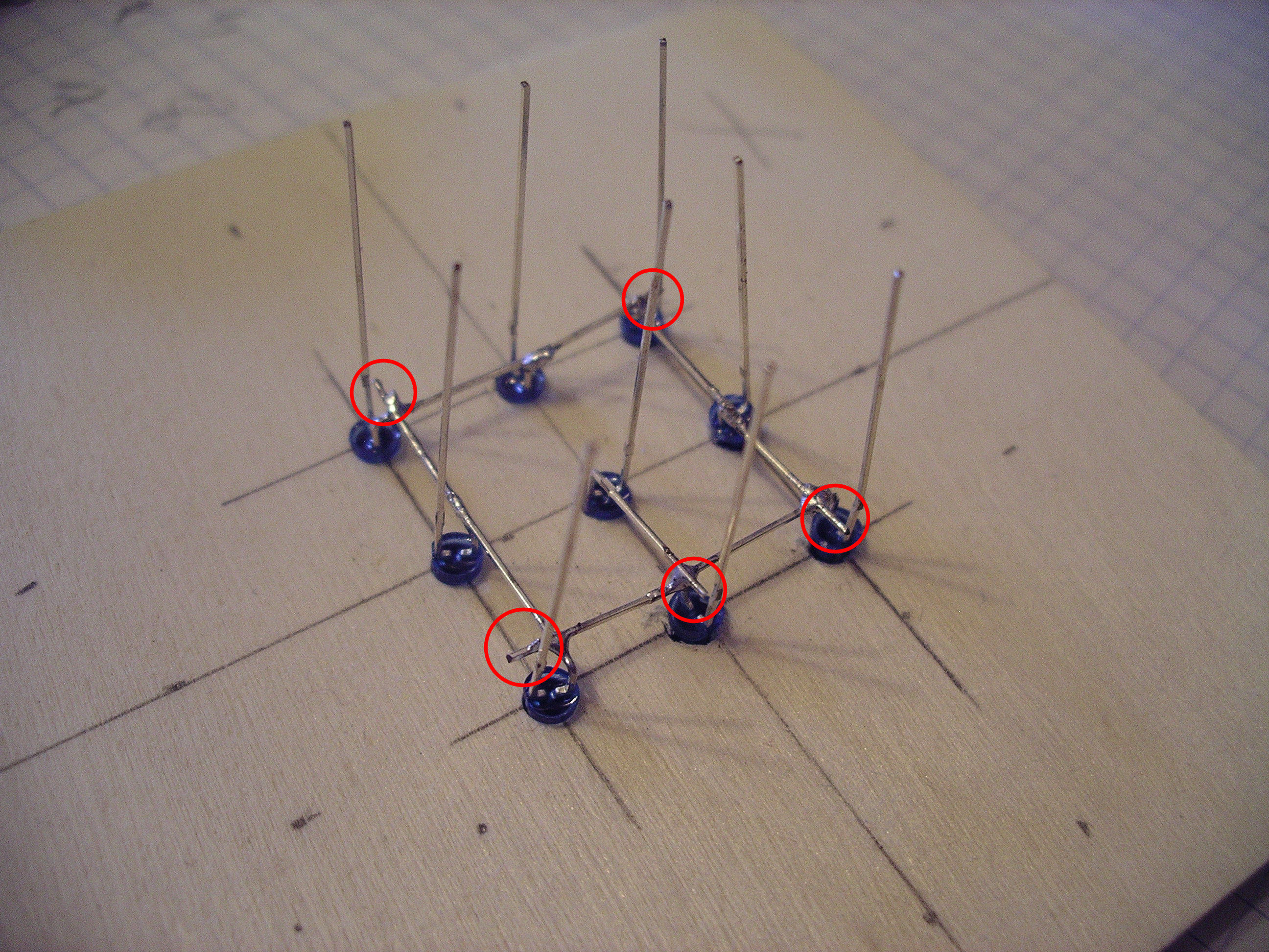 Formar un circulo de LEDs en el patrón y juntarlos con estaño. Las patas dobladas deben de estar en el interior del circulo, las patas verticales en el exterior. |